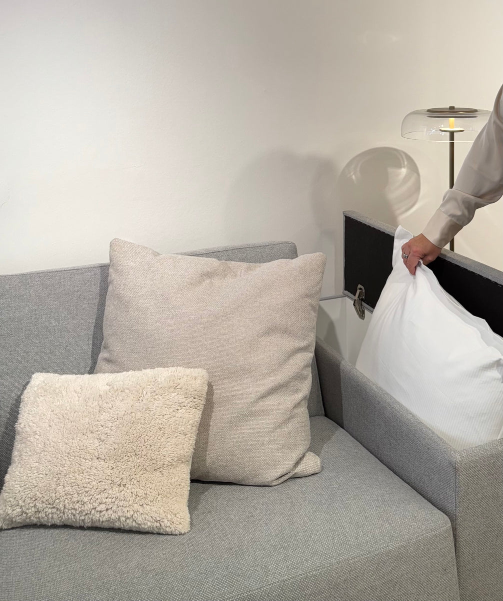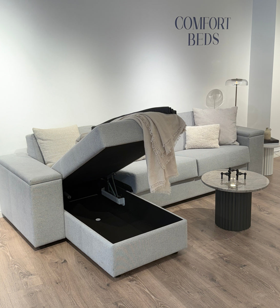 Elba Sovesofa med chaiselong har en separat indbygget seng, der slås ud på få sekunder via et diskret håndtag.
